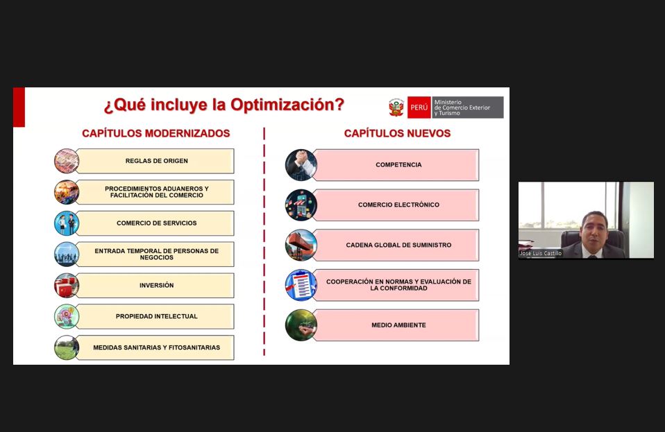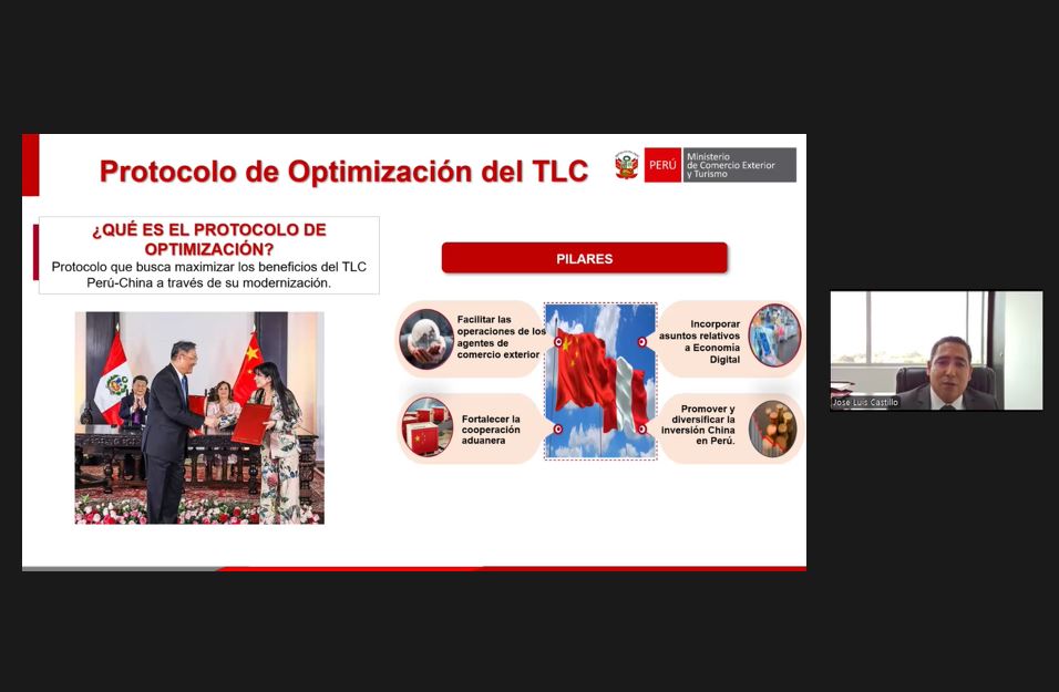 En noviembre de 2024, el Gobierno del Perú y la República Popular China suscribieron el Protocolo de Optimización del Tratado de Libre Comercio (TLC) que ambas naciones comparten. Con ello, se ha logrado alcanzar un acuerdo comercial más moderno y que responde a las necesidades y exigencias actuales del comercio internacional. Este evento tuvo como finalidad dar a conocer los principales cambios introducidos en ese acuerdo bilateral, tras su entrada en vigor el 2010, que incluye 12 capítulos (7 capítulos modernizados y 5 capítulos nuevos) y las distintas oportunidades comerciales que ofrece el mercado chino.